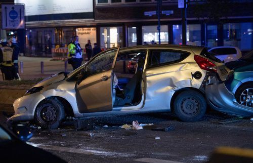 Berlin – Die Front des silbernen Kleinwagens wurde durch den heftigen Aufprall zerstört, die Windschutzscheibe ist zersplittert, die leeren Airbags hängen im Wageninneren: Bei einem schweren Unfall auf dem Berliner Kurfürstendamm vermutlich nach einem illegalen Rennen sind eine 45-jährige Autofahrer