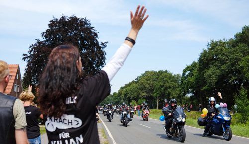 15 000 Motorradfahrer sind am Samstag in Ostfriesland am Haus des schwer krebskranken Kilian vorbeigefahren, um ihm eine Freude zu machen. Der Sechsjährige ist großer Motorradfan. Das Kind schaute begeistert vom Fenster aus zu. Anwohner winkten und applaudierten den Bikern – der Krach kam bei allen