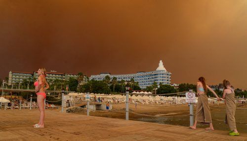 Die Lage wird immer bedrohlicher: In der Türkei sind die Einsätze gegen die zahlreichen Waldbrände an der Mittelmeerküste – hier bei Manavgat – und anderen Orten des Landes fortgesetzt worden. Feuer, die in ihrer Zahl normalerweise über einen langen Zeitraum auftreten, seien innerhalb von zwei Tag