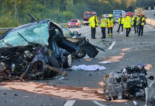 Friedberg – Horrorunfall am frühen Sonntagmorgen: Beim wohl schwersten Autounfall in Hessen seit Jahren sind auf der Autobahn 5 Richtung Kassel mindestens vier Menschen ums Leben gekommen – darunter auch zwei 19-Jährige. Vier Fahrzeuge waren an dem verheerenden Zusammenstoß am Sonntag um 4.40 Uhr be