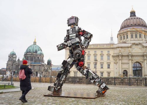 Ein etwa sechs Meter hoher „Wertgigant“ aus Elektroschrott auf dem Schinkelplatz in Berlin prangert Wegwerfmentalität und Umweltverschmutzung an. Mit der Skulptur will der Kölner Künstler HA Schult Verbraucher dazu aufrufen, defekte Elektronikartikel reparieren zu lassen, anstatt sie wegzuwerfen.