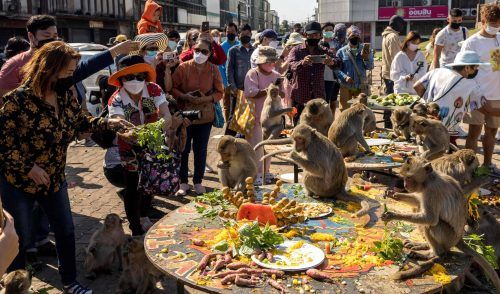 Lopburi – Es ist ein alljährliches Spektakel im thailändischen Lopburi: Seit Ende der 80er-Jahre richtet die Stadt jeweils im November ein Festmahl für die wild lebenden Makaken aus. So auch am gestrigen Sonntag. Hunderte Affen bedienten sich an den Früchten vor dem 800 Jahre alten Phra-Prang-Sam-Yo