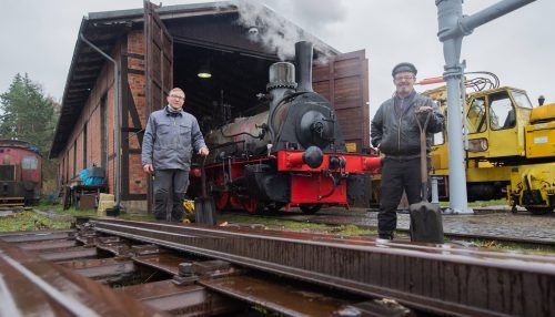 Unter Druck steht nicht nur die preußische T3 Lokomotive von 1901, die sich hier aus ihrem Schuppen im niedersächsischen Sibbesee bei Hildesheim in den Regen hinauswagt. Auch Projektleiter Jannik Wagner (l) und Harald Strube, Vorstand der Arbeitsgemeinschaft Historische Eisenbahn e.V. im Museumsbahn