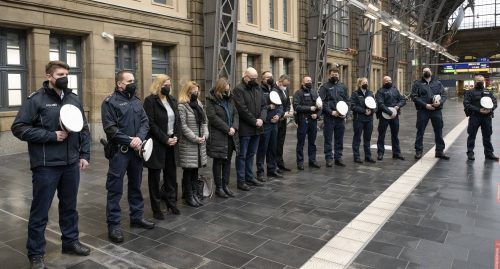 Ob in Mainz, mit Bundesinnenministerin Nancy Faeser (SPD) in Frankfurt, in Hamburg oder im Landtag von Rheinland-Pfalz (von links oben nach rechts unten). Mit einer bundesweiten Schweigeminute hat die Polizei am Freitag der beiden ermordeten Kollegen aus dem rheinland-pfälzischen Kusel gedacht. Ge