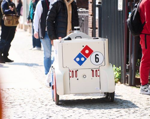 Der Pizza-Lieferdienst Domino’s testet in Berlin gerade einen Roboterwagen, der selbstständig Pizza ausliefern soll. Die Technik ähnelt der von autonom fahrenden Autos. Aufgrund der Vorschriften muss derzeit noch ein Mitarbeiter mit Fernsteuerung nebenher laufen. Bald aber, glaubt man bei Domino’s k