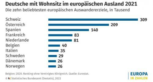 Wiesbaden – Matterhorn, delKäse und gute Verdienstmöglichkeiten: Auswanderer aus Deutschland zieht es in Europa am häufigsten in die Schweiz. Wie das Statistische Bundesamt mitteilte, hatten Anfang 2021 rund 309 000 deutsche Bürgerinnen und Bürger ihren Wohnsitz in dem Nachbarland. Den Daten der EU-