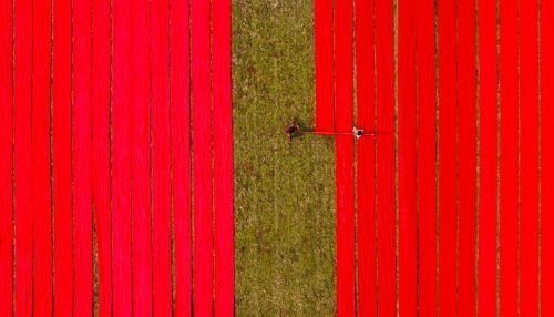 Hunderte von Metern leuchtend roter Stoff (re.) liegen ordentlich aufgereiht auf einer Fläche von rund fünf Fußballfeldern in Bangladesch. Die traditionellen Tücher – Lal Shalu genannt – bleiben etwa sechs Stunden liegen, um in der Sonne zu trocknen. Auf diese Weise wird Energie gespart und die Prod