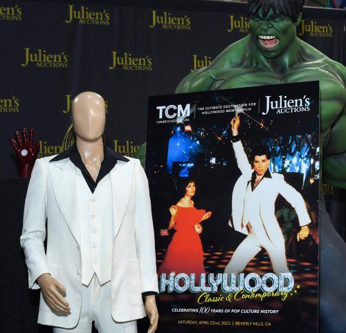 Mit Andenken aus Hollywood-Filmen ist viel Geld zu machen: Fast 1400 Gegenstände kamen am Wochenende bei einer Auktion in Kalifornien unter den Hammer. Ein Renner war John Travoltas weißer Anzug aus dem Kultfilm Saturday Night Fever von 1977. Der weiße Polyesteranzug mit Jacke, Weste und Hose (re.)