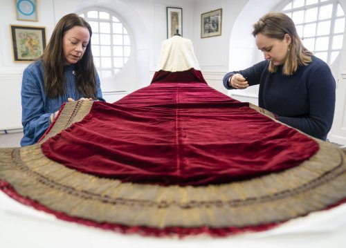 Hier wird noch einmal Hand angelegt an die Robe, die König Charles am kommenden Samstag tragen wird. Traditionell wird das Königspaar zu der Krönung zwei unterschiedliche Gewänder tragen: Purpurrote Staatsroben bei der Ankunft an der Westminster Abbey und purpurne Roben nach dem Gottesdienst. Charle