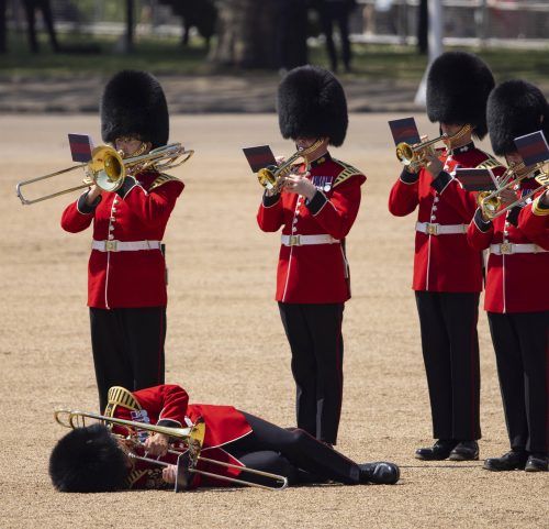 Mit den Wolluniformen und den Bärenfellmützen ließ es sich am Samstag offenbar nur schwer in der Londoner Hitze aushalten: Mindestens drei britische Wachen sind bei Proben für die anstehende Geburtstagsparade von König Charles kollabiert. Auf einem Video ist zu sehen, wie ein Posaunist zu Boden fäll