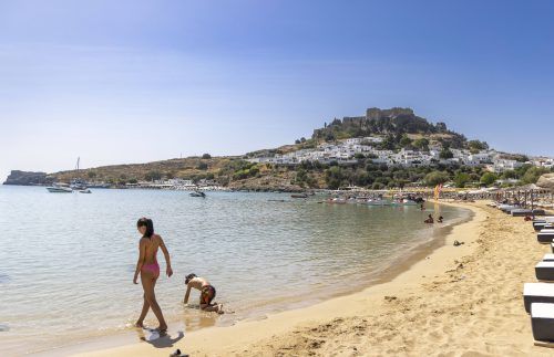 Rhodos – Majestätisch ragt die Akropolis von Lindos in den blauen Sommerhimmel, ganz so, wie sie es seit über 2000 Jahren tut. Den besten Blick auf das antike Wahrzeichen der Insel Rhodos haben die Touristen vom direkt daneben gelegenen Lindos Beach aus, wo sie sich auch am Mittwoch in der Hitze auf