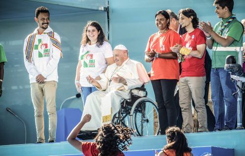 Es ist der Moment, auf den hunderttausende Jugendliche seit Tagen gewartet haben: Papst Franziskus tritt zum ersten Mal beim Weltjugendtag auf. Als er am Donnerstagabend die Bühne im Park Eduardo VII mitten in Portugals Hauptstadt Lissabon betritt, erfasst eine Welle des Jubels die Menge. Die 25 H