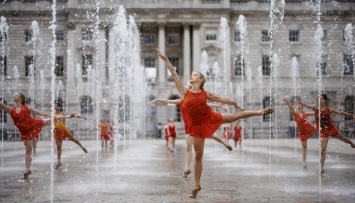 Es ist ein im Wortsinn erfrischender Anblick, der sich den Zuschauern dieser Ballett-Aufführung im Herzen Londons bietet. Tänzerinnen und Tänzer proben unter den Fontänen der Springbrunnen des Somerset House im Herzen Londons für das Stück „Counterpoint“. Am kommenden Wochenende wird es mehrfach zur