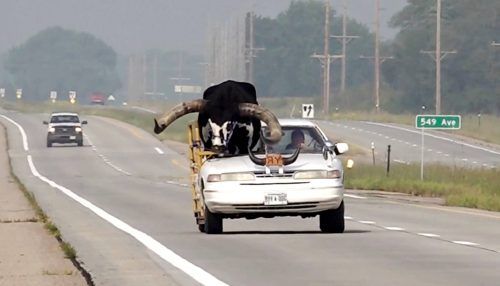 Unglaublich: Seinen riesigen Watussi-Bullen transportiert Lee Meyer in Nebraska auf dem Beifahrersitz seines Mittelklassewagens. Er war mit „Howdy Doody“ auf dem Weg zu einem Rodeo. Die Polizei erhielt mehrere Notrufe von Autofahrern auf dem Highway 275. Polizeisprecher Chad Reiman zum TV-Sender „Ne