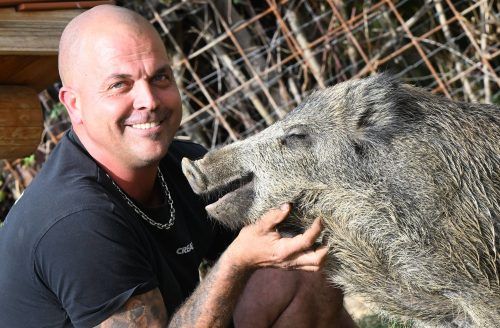 Friedrich Hannibal Schnitzel, seines Zeichens Wildschwein, braucht seine täglichen Streicheleinheiten. Friedrich, so sein Rufname, ist ein noch sehr junger und inzwischen sehr zahmer Keiler, den Dennis Renschler aus der Tiernotrettung zu sich nach Birkenfeld in Baden-Württemberg geholt hat. Seitde