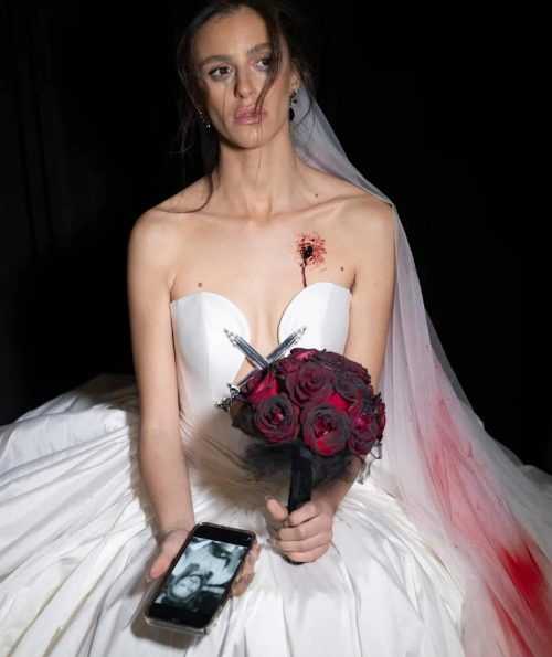 Tel Aviv – Blut rinnt aus einem Loch in ihrem Brustkorb, ihr Make-up ist verlaufen, ihr Blick leer. Jessica Elters Hände umklammern einen Brautstrauß aus Rosen. Doch Ben, der Mann der jungen Frau mit der aufgemalten Schusswunde, ist tot – ermordet bei dem Hamas-Terrorangriff vom 7. Oktober. Bei eine