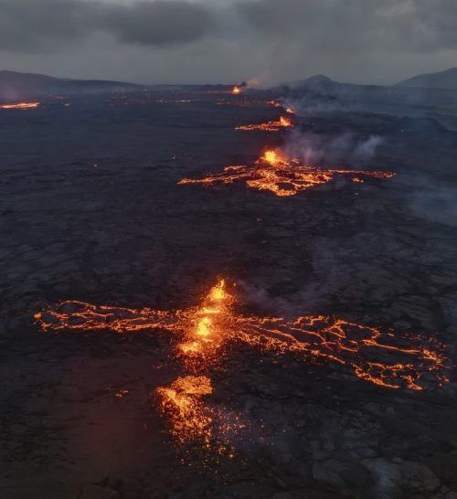 Grindavík – Meterhoch sprudelt die orange-rote Lava aus dem Boden nördlich vom Küstenort Grindavík auf Island, begleitet von massiven Rauchwolken. Was aus der Ferne aussieht wie ein flächiger Waldbrand, ist bei näherer Betrachtung eine riesige