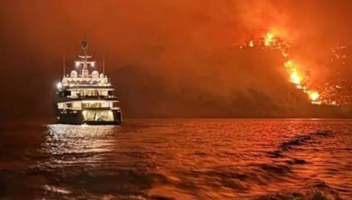 Die Feuerwehr postete auf Facebook ein Bild von dem Feuer auf Hydra. Das Feuerwerk einer Jacht-Besatzung hatte den Brand ausgelöst. © Facebook