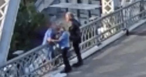 Die Szene von der Brücke: Bon Jovi (re.) hilft der Frau über das Geländer. © MNPD Nashville