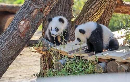 Mit tapsigen Schritten haben die Berliner Panda-Zwillinge Leni und Lotti zum ersten Mal ihr Außengehege erkundet. Die sieben Monate alten Jungtiere machten dabei auch erste Kletterversuche auf dem großen Gerüst. Die Tierpfleger des Berliner Zoos achteten darauf, dass die Tiere nicht herunter plumpst