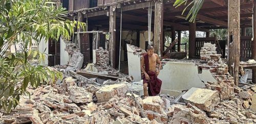 Ein buddhistischer Mönch steht in den Trümmern eines beschädigten Gebäudes in einer Klosteranlage. © Oo/dpa