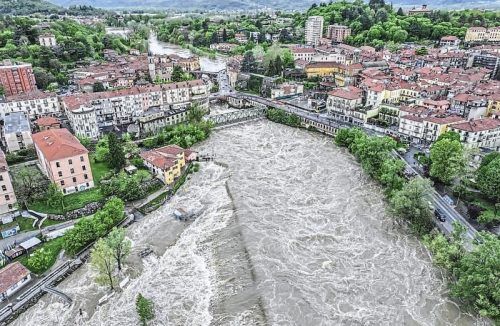 Nach heftigen Regenfällen ist der Fluß Dora Baltea in Ivrea in Piemont/Italien über die U