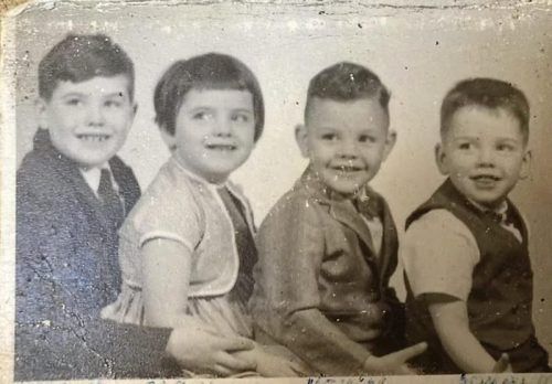 Gruppenbild der wiedergefundenen Geschwister: Kevin (li.) und sein leiblicher Bruder Keith (sitzt ganz rechts mit schwarzem T-Shirt). Carol steht neben ihrem leiblichen Bruder Ross (im blauen Sakko mit Krawatte). Unten sind die Kinderbilder von Kevin mit seinen „Geschwistern“ und rechts von Ross. ©