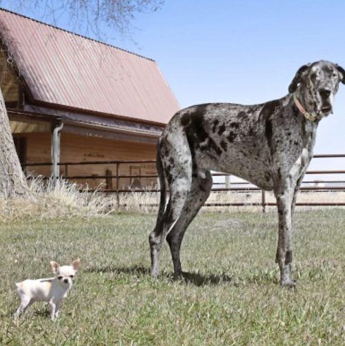 Wau – das nennt man zwei ungleiche Freunde. Denn laut des Guinness-Buchs der Rekorde trafen sich jetzt in Idaho der größte und der kleinste Hund der Welt zum Spielen. Die dänische Dogge Reggie und Chihuahua-Dame Pearl verstanden sich auf Anhieb tierisch gut. Reggie ist sieben Jahre alt und 1,007 Met