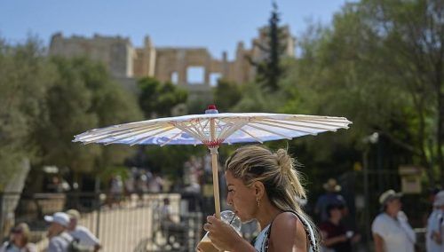 Mörderische Hitze: Eine Touristin mit einem Sonnenschirm steht auf der Akropolis. © Giannakouris/dpa