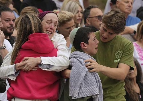 Familienangehörige eines Opfers der Schießerei vom Sonntag trauern an einem Blumendenkmal, das nach dem Anschlag am Bondi Beach in Sydneyerrichtet wurde. © Baker/dpa