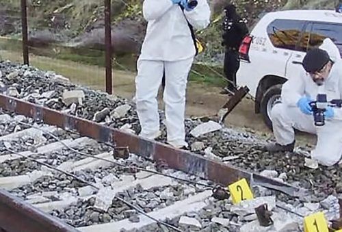 Polizisten untersuchen das gebrochene Gleisstück an der Unglücksstelle. © Guardia Civil/dpa