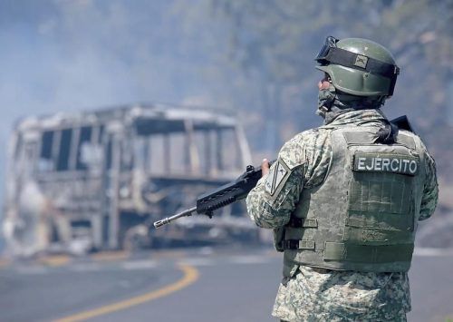 Ein Soldat steht neben einem ausgebrannten Bus, der nach dem Tod „El Menchos“ in Brand gesetzt wurde. © Solis/dpa