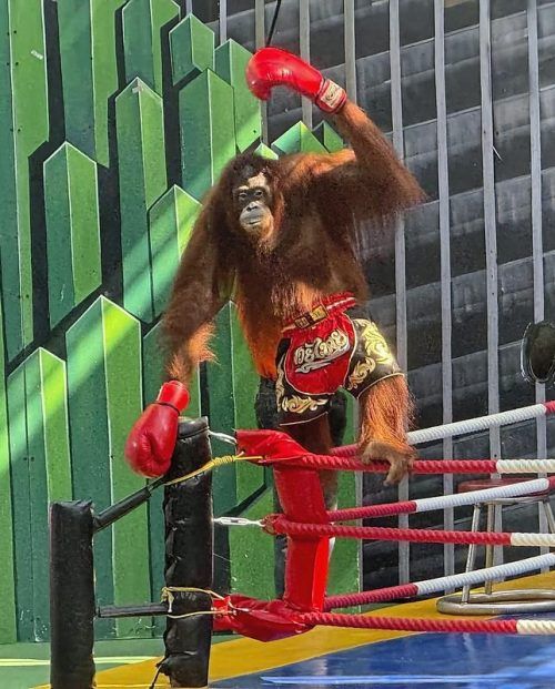 Um zehn Uhr morgens findet nahe Bangkok ein Boxkampf statt. Hunderte Zuschauer drängen sich vor der Bühne, aber in den Ring im thailändischen Vergnügungspark Safari World steigen keine Menschen, sondern zwei Orang-Utans. „Orang-Utans gehören in die Baumkronen des Regenwaldes – nicht in Boxringe oder