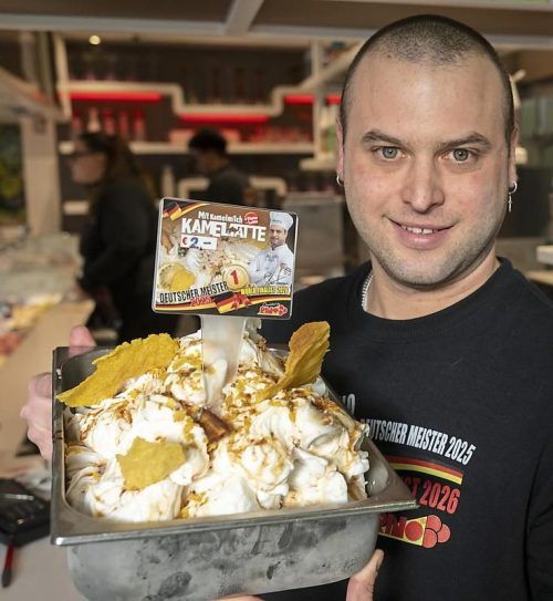 Gelatiere Thomas Micolino mit seinem Kamelmilch-Eis. © Marijan Murat/dpa