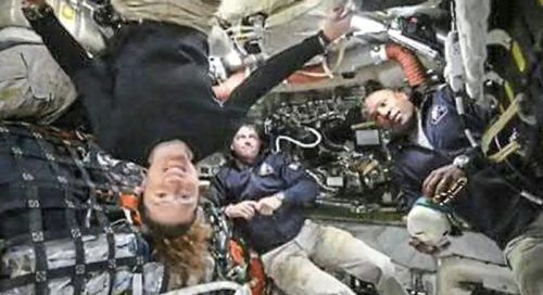 Gute Stimmung: Die Astronauten Christina Koch, Reid Wiseman und Victor Glover (v. li.) schickten in einem Livestream Grüße zur Erde. © Nasa/AFP