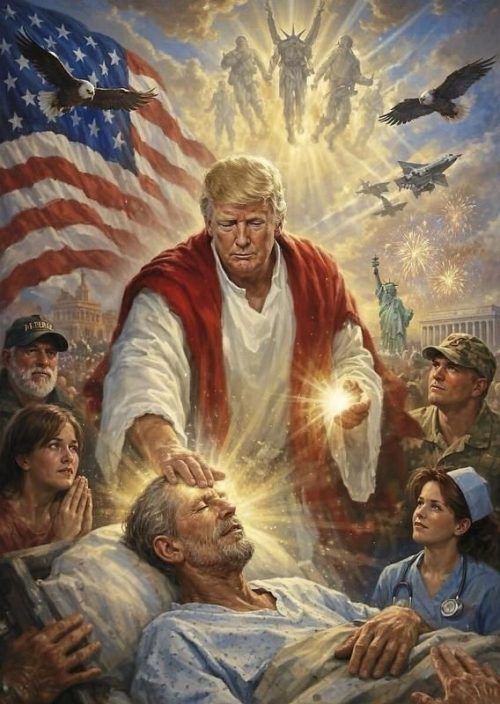 Erst beschimpft Präsident Trump Papst Leo, dann postet er auf seiner Plattform Social Truth dieses KI-Bild von sich als Jesus-gleichen Erlöser. © Handout/AFP, Brandon/dpa