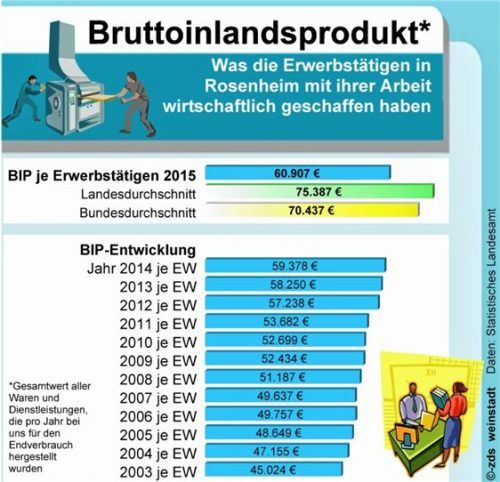 Rosenheim – Das Bruttoinlandsprodukt (BIP) Deutschlands hat seit 2003 um 41,2 Prozent zugelegt, in Rosenheim sogar um 47,9 Prozent. Zuletzt erreichte die hiesige Wirtschaftsleistung laut Statistik 2,89 Milliarden Euro. Der Output jedes Erwerbstätigen lag damit in Rosenheim bei 60907 Euro (Vorjahr: 5