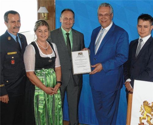 Beim diesjährigen „Blaulichtempfang“ zeichnete Bayerns Innenminister Joachim Herrmann wieder Betriebe aus, die Ehrenämter ihrer Beschäftigten besonders unterstützen. Darunter auch die Fischer Formtechnik aus Prien. Inhaber Gerhard Fischer, seine Frau Angie Fischer und Sohn Julian (im Bild; ganz link