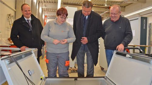 Die Elektro Kreutzpointner GmbH mit Sitz in Burghausen hat kürzlich die 100. Frau im Unternehmen begrüßt. Die 32-jährige Schaltanlagenbauerin Ramona Helmberger wurde von Firmenchef Fritz Kreutzpointner (links) im Beisein von Innenstaatssekretär Stefan Mayer (CSU) willkommen geheißen. Die Frauenquote