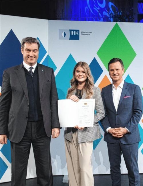 Bei einem Festakt der IHK im Münchner GOP Varieté-Theater erhielt Emily Krasowski (Mitte) aus dem Landkreis Mühldorf den Meisterpreis der bayerischen Staatsregierung. Die geprüfte Technische Fachwirtin gehört mit ihren Prüfungsleistungen zur Gruppe der 181 oberbayerischen Spitzenabsolventen in 70 ve