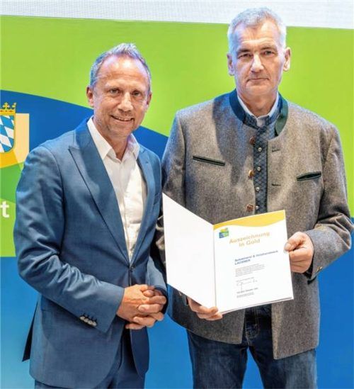 Die Schreinerei Lackner in Erlstätt ist für ihre langjährige erfolgreiche Teilnahme am Umwelt- und Klimapakt Bayern mit der höchsten Auszeichnung in Gold des Bayerischen Umweltministeriums ausgezeichnet worden. „Diese Urkunde ist für uns eine große Ehre“, freute sich Firmenchef Herbert Lackner (rech