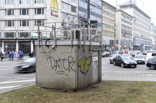 München – Sonnenstraße, Ecke Schwanthalerstraße: Vier Fahrspuren von Süd nach Nord, fünf von Nord nach Süd. Zwei von Ost nach West, drei von West nach Ost. Mehr Kreuzung als hier am Münchner Stachus ist kaum möglich. Und doch steht dort etwas, was nicht hingehört: ein Messhäuschen d