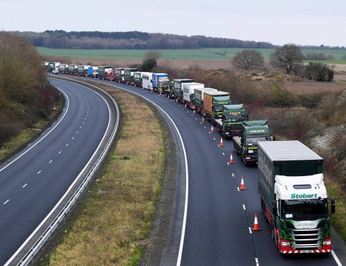Die britische Regierung sorgt weiter für den Fall eines harten Brexit vor. Um zu prüfen, wie sich trotz der in diesem Fall wieder nötigen Grenzkontrollen Staus vermeiden lassen, ließ sie am Montag 89 Lastwagen auf dem stillgelegten Flughafen von Manston knapp 32 Kilometer vom Hafen von Dover auffahr