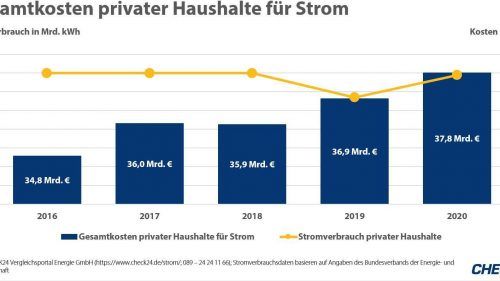 München – Die Haushalte in Deutschland haben 2020 so viel für ihren Strom bezahlt wie noch nie. Insgesamt waren es nach Berechnungen des Vergleichsportals Check24 rund 37,8 Milliarden Euro, gut 900 Millionen Euro mehr als 2019. Im Vergleich zum Jahr 2016, als der private Verbrauch mit rund 127 Milli