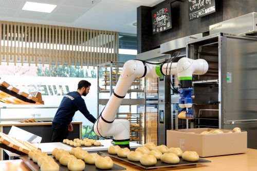 München – Als die Croissants fertig sind, fährt der mannshohe Roboter auf einer Schiene zum Ofen und führt seinen blauen Greifarm in dessen heißen Innenraum. Vorsichtig nimmt er die Backwaren, dreht sich um und legt sie für die Kunden in die Auslage. Dann sieht er, dass die Semmeln