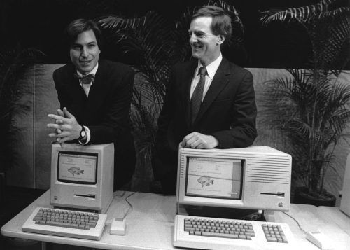 Als der Apple Macintosh vor 40 Jahren vorgestellt wurde (im Bild Gründer Steve Jobs und der damalige Präsident von Apple John Sculley) , war er nicht der erste PC auf dem Markt. Er war zunächst auch kein Kassenschlager, aber trotzdem gilt er als ein Meilenstein in der Technik-Geschichte. Es ist Appl