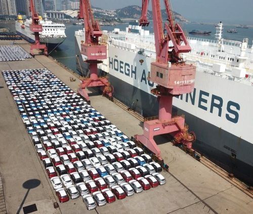 Im Hafen von Lianyungang in der ostchinesischen Provinz Jiangsu liegt ein Frachter bereit, der mit in China hergestellten Autos für den Export beladen werden soll. Peking subventioniert die Branche mit vielen Milliarden. © Geng Yuhe
