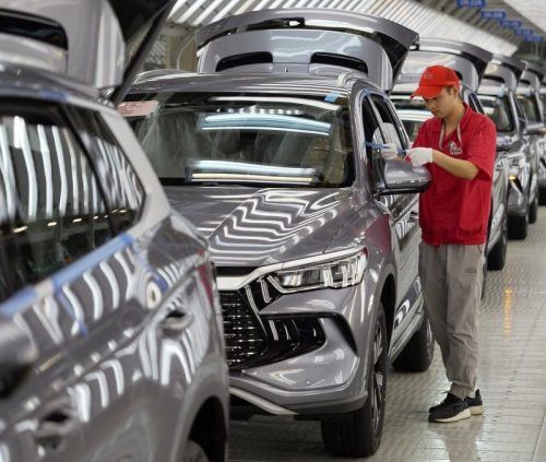 New Energy Vehicle (NEV) heißen die Elektroautos aus China (im Bild Produktion beim führenden NEV-Hersteller BYD in Zhengzhou). Laut EU werden sie mit unfairen Staatssubventionen gebaut. © Li Jianan, dpa