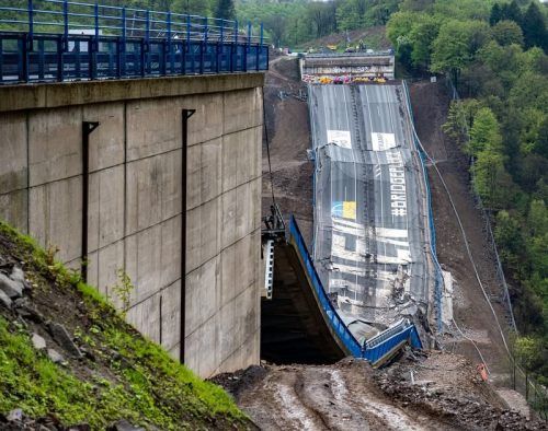 Die deutschen Fernstraßen sind teilweise in schlechtem Zustand (im Bild die planmäßig gesprengte Rahmedetalbrücke). Neue Investitionen könnten jetzt empfindlich zusammengestrichen werden. © Markus Klümper/dpa