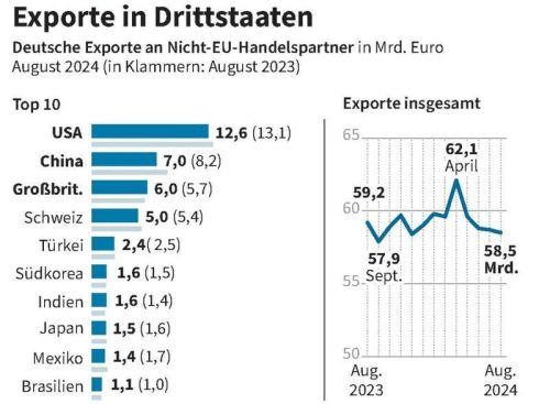 Wiesbaden – Die schwächere Nachfrage wichtiger Handelspartner drückt auf das deutsche Exportgeschäft mit Ländern außerhalb der EU. Im August gaben die Ausfuhren in die USA im Vergleich zum Vorjahresmonat um 3,2 Prozent auf 12,6 Milliarden Euro nach, wie das Statistische Bundesamt in Wiesbaden auf Ba